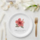 Beautiful coral red and white hibiscus wedding paper plates featuring modern watercolor designs with tropical greenery and exotic flowers for an elegant Hawaii celebration.