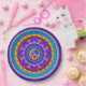 Hand painted artwork inspired by otomi embroidery style decorative patterns. Depicts weimaraner in center of circles and floral patterns along with rabbits running around the outer circles of muli-coloured layers of bright hues on a dark blue background.