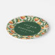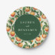 This wedding plate features a charming design with a repeating pattern of illustrated peaches and green leaves on a light cream background, creating a fresh and inviting look. The central circle in deep forest green highlights customizable text in elegant serif font for names and a simpler sans-serif style for the date, adding a touch of sophistication. The whimsical and romantic theme is enhanced by the hand-painted aesthetic, making it perfect for celebrating your special day with a natural and cheerful vibe.