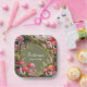 A watercolor illustration of red and orange mushrooms growing in a forest setting. The mushrooms have large, bright red caps with white spots and white stems. Multiple mushrooms of varying sizes are arranged around a central green space, creating a natural frame. The mushrooms grow from moss-covered tree roots and branches that wind through the composition. Green ferns and small plants with delicate leaves are scattered throughout the scene. The background features muted green and blue tones, with a darker olive green central area. The illustration has a soft, ethereal quality typical of watercolor paintings, with gentle color transitions and subtle texture effects. The mushrooms cast subtle shadows beneath them, adding depth to the composition. The artwork has a whimsical, fantasy-like quality with the mushrooms arranged in a circular pattern around the central green space.