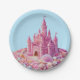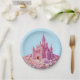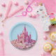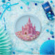 Un ilustracion vibrante de un majestuoso castillo rosa con múltiples torres y banderas, enclavado en un mágico lecho de conchas pastel, coral y suaves flores de inspiración oceánica. La arquitectura de cuento de hadas del castillo es detallada y majestuosa, alta contra un cielo azul claro. La composición circular añade un encanto extraordinario, haciendo de este diseño un lugar perfecto para los amantes de la fantasía y las celebraciones oníricas de temática costera.