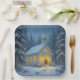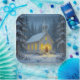 A charming church, nestled in a snowy forest landscape, glows warmly from its illuminated windows, creating a beautiful contrast with the cool, tranquil surroundings