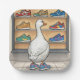 A duck stands in a shoe store, wearing bright pink and blue sneakers while gazing at a display of colorful sneakers