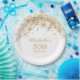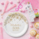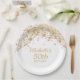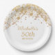 Platos de papel de cumpleaños blancos con purpurina dorado y luces de cuerdas personalizadas con el nombre y la edad del invitado de honor.