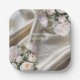 A high-resolution botanical illustration of a luxurious bouquet of white roses and white peonies against a white satin texture pattern with white snowy glitter. The arrangement features six fully bloomed peonies and three unopened buds. The largest peony in the center is pure white with delicate layered petals. To its right is a pink-peach colored peony with subtle red veining throughout. The flowers are accompanied by rich green leaves and stems. The leaves are large, glossy, and have prominent veining. The buds are a mix of light pink and cream colors, with one bud showing a deeper pink coloring at its base. The composition is symmetrical, with flowers positioned at different heights to create depth. The petals have a soft, velvety texture with subtle shadows that enhance their dimensional quality. The illustration has a painterly quality with careful attention to the natural variations in the flower petals and leaves.