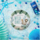 Add a fun, modern touch to your party table with these Wild One paper party plates designed for a first birthday celebration. The design features soft teal blue balloons for a cheerful, playful look, paired with the phrase Name Is A Wild One! The text is shown in a bold rustic teal blue font mixed with a clean gray sans serif for a fresh, modern feel. Space is included to personalize the child’s name.