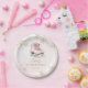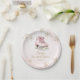 A beautiful ice-skating birthday paper plates featuring soft pink tones, elegant gold snowflakes, and watercolor ice skates. Perfect for winter birthdays and girls skating parties.