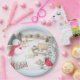 El plato festivo de la fiesta navideña incluye un muñeco de nieve ilustrado que da la bienvenida al invierno con los brazos abiertos. Disfrute de la magia de la temporada con este encantador muñeco de nieve en el jardín de invierno. Friendly snowman comparte un mensaje alegre con amigos cardenales y conejitos. Ilustracion Currier & Ives de judithchengart, diseñado para traer un toque de brillo a su fiesta Navidad.