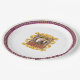 De una serie original de diseños para placas de coleccionistas de música clásica, esta Placa de papel presenta un retrato del compositor Wolfgang Amadeus Mozart. El retrato es un grabado a mano, rodeado por un ilustracion original de un marco dorado ovalado con cintas doradas en la parte superior. El marco está sobre un fondo de papel pintado morado con filas de racimos de uvas doradas y rayas blancas verticales. Bajo el retrato, en rojo, está el nombre del compositor. El papel pintado está rodeado de más cintas doradas, en el centro de la placa con fondo blanco. Hay una banda violeta con racimos dorados de uvas y un borde rojo alrededor del plato.