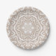Esta mandala blanca se sienta sobre un fondo marrón claro o bronceado. El color es suave y natural. En algunas luces puede parecer un gris cálido. Parte de la colección Losonieth Mandala.