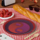 Platos de San Valentín de corazón púrpura y rojo yin yang.