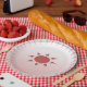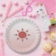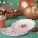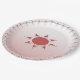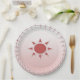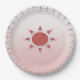 Disfrute de la suntuosa comida en los platos elaborados con gusto. El diseño de la placa de papel que se muestra en la imagen presenta un motivo de sol minimalista. En el centro de la placa se encuentra un sol estilizado, con un centro circular audaz y unos rayos simétricos agudos que se extienden hacia el exterior. El diseño se basa en una paleta de color rosa suave, lo que le da al plato un aspecto cálido y elegante. El borde del plato está decorado con una estrella repetida o con un estilo geométrico de puntada, añadiendo un sutil borde decorativo que complementa el diseño central del sol. La estética general es festiva pero refinada, ideal para celebraciones como cumpleaños, duchas para bebés o elegantes fiestas de brunch. La escena en la mesa realza el ambiente de celebración, con globos de cobre, cubiertos de oro, un regalo envuelto y un vaso de dulces pastel, todo lo cual contribuye a una temática fiesta cohesiva y de gama alta. Elegante y llamativo, este exclusivo diseño solar es perfecto para reuniones elegantes.