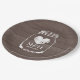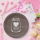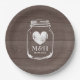 Placas de fiesta de papel para paneles de grano de madera con monograma boda más fecha de matrimonio. Marrón y blanco. Color del personalizable y personalizar el nombre de las letras iniciales de novia y novio. Tipografía elegante en diseño rústico de tarros de moda de albañil. Diseño romántico con ícono de corazón vintage. Símbolo de amor fatigado. Platos desechables para boda elegante, ducha de novia, compromiso, aniversario o fiesta de soltera. Color del fondo del personalizable. Perfecto para boda de granero al aire libre en verano alrededor de julio, agosto, septiembre.