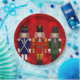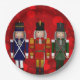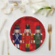 Trio de los navidades Nutcracker - Tres Nutcrackers están uno al lado del otro sobre un patrón de bokeh de Navidades rojos. El primer petardo está vestido de azul y blanco con adornos dorados. El petardo central está vestido de rojo y oro con adornos dorados. El tercer petardo está vestido de verde y blanco con adornos plateados. Cada una de estas galletas nudistas está disponible por separado en diversos regalos y productos de Zazzle. Elija cualquiera de los tamaños de las placas de papel.
