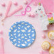 Platos de papel para fiestas mostrados con una celebración de estampado de gorras de graduación.