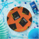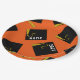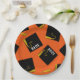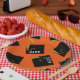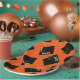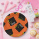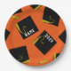 Platos de fiesta de graduación naranja creativos con gorras de graduación negras y doradas. Para personalizar, edite el texto para agregar el nombre del graduado y el año de la clase de último año.