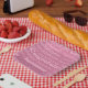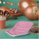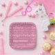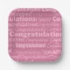 Una felicitación de boda con la palabra felicidades repetida. Este diseño se ve realmente efectivo en estos platos de papel