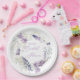 De nuestra colección de amor a la lavanda, el amor está en flor con estos elegantes platos de papel. Tonos púrpura, lavanda, lila y azul adornan las flores delicadas. Este diseño ultra femenino seguramente atraerá miradas. Disponible en muchas medidas y formas.