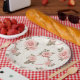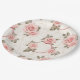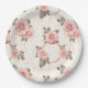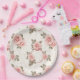Se muestra un plato de papel para fiestas con una encantadora impresión de rosas rosadas sonrojadas.