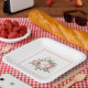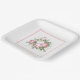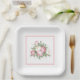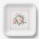Se muestra platos de papel para fiestas en blanco con una encantadora impresión de rosa rosa vintage.