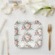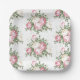 Se muestra platos de papel para fiestas en blanco con una encantadora impresión de rosa rosa vintage.