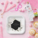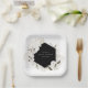 Platos de papel para ducha de novia floral bohemio elegante. Flores de acuarela blancas y delicado follaje verde marco geométrico negro.