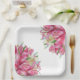 Se muestra el plato de papel para fiestas con una impresión artística de hermosos lirios rosados.