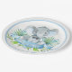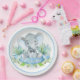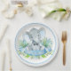 Platos de papel para baby shower de elefante para niños con adorable elefante bebé con corbata de lazo sobre fondo de hoja de palma. Estos adorables platos de papel para baby shower de elefante se pueden personalizar fácilmente para su evento simplemente agregando el texto que desee. También puede cambiar el color de fondo en estos adorables platos de papel para baby shower de elefante para niños.