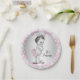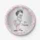 Platos para baby shower de princesa con linda princesa vintage que lleva pantalones y zapatillas de volantes rosados sobre un bonito fondo de encaje rosa y blanco y lazo rosa con elegante texto de es una princesa. Estos lindos platos de papel para baby shower rosados y plateados se pueden personalizar con el texto en el estilo de letra y color de su elección. Puede mover al bebé según sea necesario y eliminar el texto de es una princesa para agregar el suyo.