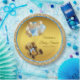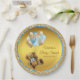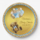 Platos de papel para baby shower de oso de peluche con adorable oso de peluche y bonitos globos azules y dorados sobre un hermoso fondo azul bebé y dorado. Estos platos de papel para baby shower de oso de peluche se personalizan fácilmente con el texto que elijas.