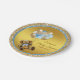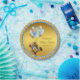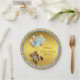 Platos de papel para baby shower de oso de peluche con adorable oso de peluche y bonitos globos azules y dorados sobre un hermoso fondo azul bebé y dorado. Estos platos de papel para baby shower de oso de peluche se personalizan fácilmente con el texto que elijas.