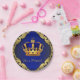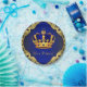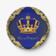 Platos de papel para baby shower del príncipe con corona dorada y azul real elegante y pancarta azul 'es un príncipe' sobre un fondo azul rico con remolinos dorados. Puedes personalizar con el texto de tu elección en el estilo de fuente que prefieras. Puedes mover la corona según sea necesario.