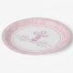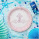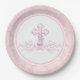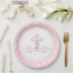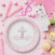Platos de papel para bautizo de niña con hermosa cruz de perla rosa en remolino sobre fondo de damasco rosa. Estos elegantes platos de papel rosados para bautizo se personalizan fácilmente añadiendo texto. También puedes mover la cruz según sea necesario en estos platos de papel para bautizo, bautizo y primera comunión con damasco rosa.
