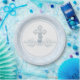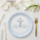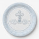 Platos de papel para bautizo de niño con hermoso remolino de perlas azules en cruz sobre fondo de damasco azul. Estos elegantes platos de papel azules para bautizo se personalizan fácilmente simplemente agregando texto. También puede mover la cruz según sea necesario en estos platos de papel para bautizo, bautizo y primera comunión azules.