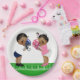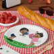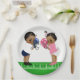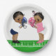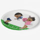 Platos de papel para baby shower de fútbol con un adorable niño y niña étnicos afroamericanos que visten adorables trajes de fútbol rosa y azul sobre un fondo de color elegido por usted. Estos adorables platos de papel para baby shower de fútbol se personalizan fácilmente para su evento simplemente agregando el texto que desee.