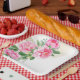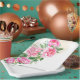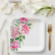 Este plato de papel se muestra con una hermosa impresión de peonías rosadas.