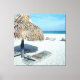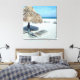 Disfrute de esta relajante imagen de viaje vacacional de una playa de arena blanca con cabaña de playa frente a palmeras y tumbonas de madera. Paisaje con agua azul y cielo. Una hermosa escena costera es una excelente manera de tomar un descanso mental y tener un día de desestrés. Todos los diseños Copyright © www.CuteComfy.com Este diseño está disponible como una colección completa!