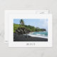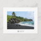Postal con playa de arena negra volcánica en el Parque Estatal Waianapanapa a lo largo de la famosa carretera a Hana en la isla tropical de Maui, Hawaii, EEUU con un borde blanco y el texto: 'Maui'.