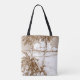 Un tote con letras de guijarros personalizados en un arte azul y tropical vintage de palmeras en una playa de arena y hermosas nubes sobre olas oceánicas tranquilas en marrón oscuro.