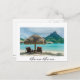 La postal con un parasol cubierto con paja y dos sillas del sunlounger en una arena blanca varan en un centro turístico de lujo de la casa de planta baja del overwater en la laguna azul clara de la isla del Pacífico de Bora Bora, cerca de Tahití en Polinesia francesa con una frontera blanca y el texto: "Bora Bora".