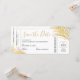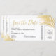 Diseño moderno, elegante y sencillo de hojas de palma de Relieve metalizado dorado en una boda moderna y divertida en un destino de playa tropical, salvo la tarjeta de fecha que parece un billete de embarque de avión. Cada parte de nuestra plantilla de tickets de plano de moda es editable para que puedas crear una que se adapte a tus colores y temas bodas. Hay espacio para añadir detalles de viaje en la parte posterior, o borrar el diseño en la parte posterior si los detalles aún no están listos, puedes añadir una foto o tu propio monograma de boda usando el diseñador avanzado, simplemente haz clic en 'personalizar más adelante'.