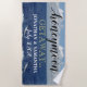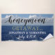 Luna de miel Tema de la playa Getaway. Personalice los nombres de los recién casados en texto blanco y fecha de boda. La luna de miel está escrita en escritura negra. Getaway está escrito en una fuente fresca amarilla. El fondo tiene un océano azul bonito con olas de espuma blanca y un cielo azul claro con grandes nubes blancas onduladas. Toallas de playa para el nuevo Mr. y Mrs. Original Photography Design © TamiraZDesigns.