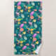 Imágenes tropicales divertidas hacen un patrón colorido en esta linda toalla de playa. Las imágenes incluyen un pájaro toscano, un flamingo rosado, un cono de helado, helados, una rodaja de pomelo brillante y un limón, todo rodeado de estrellas audaces y hojas de palma verdes. Las imágenes, multicolores y brillantes, se colocan sobre un fondo verde azulado oscuro y se repiten a lo largo de la superficie de la toalla. En la parte inferior hay un óvalo verde azulado que coincide con su nombre, monograma u otro texto personalizado.