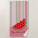 Este divertido diseño tiene una rebanada refrescante de sandía sobre un fondo rayado. Las rayas son verdes, rojas, rosas y blancas.