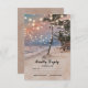 Vintage beach destinate Bodas Rsvp con una romántica puesta de sol tropical en la playa con frondosas palmeras y luces de cuerda.