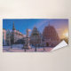 Atardecer cubierto de nieve en la plaza del ayuntamiento de Riga en invierno en Riga, Letonia. Vista de la famosa Casa de las Cabezas Negra y la Estatua de Roland contra el cielo azul con luces de puesta de sol