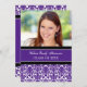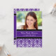 Tarjeta fotográfica personalizado invitada a la fiesta de graduación con elegante y sofisticado diseño de damasco floral moderno morado, negro y blanco. Personalizar esta tarjeta de foto de grado añadiendo el año de tu graduación, tu propia foto y los detalles de tu fiesta de graduación.