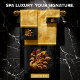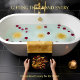Un impresionante pavo real con plumas doradas muestra con gracia su vibrante plumaje contra un fondo blanco sereno.