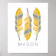 Un trío de plumas estilizadas en tonos terrosos de amarillo, dorado, gris y crema, personalizadas con el nombre de su hijo o cualquier texto que elija.