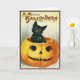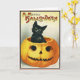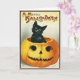 Una tarjeta maravillosa de Halloween del vintage con un pequeño gato negro dulce que se sienta en una linterna del o del enchufe. Restaurado cuidadosamente y dado un marco diseñado.